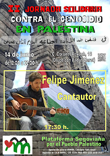 La Plataforma Segoviana por el Pueblo Palestino convoca la II jornada solidaria contra el genocidio en Palestina ante la situación de genocidio que vive el pueblo palestino por el asedio y violencia sistemática, bombardeos sobre la población civil, asesinato de más de 60.000 personas.